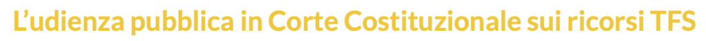 Come anticipato con il precedente Notiziario n. 4, nella giornata di martedì 10 febbraio, si è tenuta presso la Corte Costituzionale l’udienza pubblica nella quale sono stati discussi tre ricorsi contro il pagamento differito (fino a 7 anni!) e rateale (fino a 3 rate annuali, senza interessi e rivalutazione) del TFS (Trattamento di Fine Servizio) dei dipendenti pubblici, che i TAR Marche, Lazio e Friuli-Venezia Giulia hanno rimesso alla Consulta per sospetta incostituzionalità.